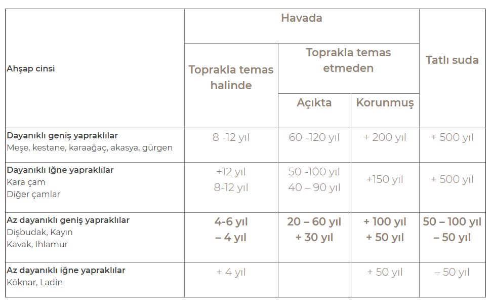 Aşağıda mimaride yaygın olarak kullanılan ağaç çeşitlerinin ortalama ömürleri bulunmaktadır: